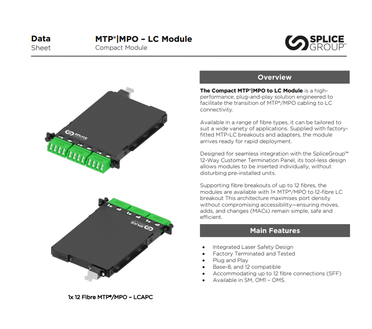 Available in a range of fibre types, it can be tailored to suit a wide variety of applications. Supplied with factory fitted MTP-LC breakouts and adapters, the module arrives ready for rapid deployment.