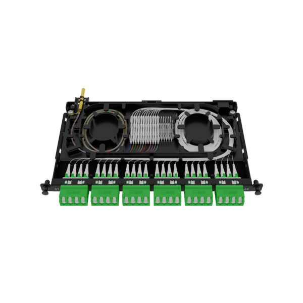 Its compact layout maintains bend-radius control at every stage, while two dedicated fibre storage areas support clean, well-organised fibre routing.
