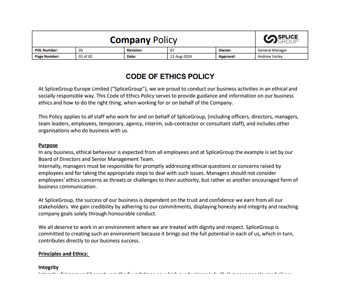 SpliceGroup Inclusion, Diversity and Equal Opportunities Policy