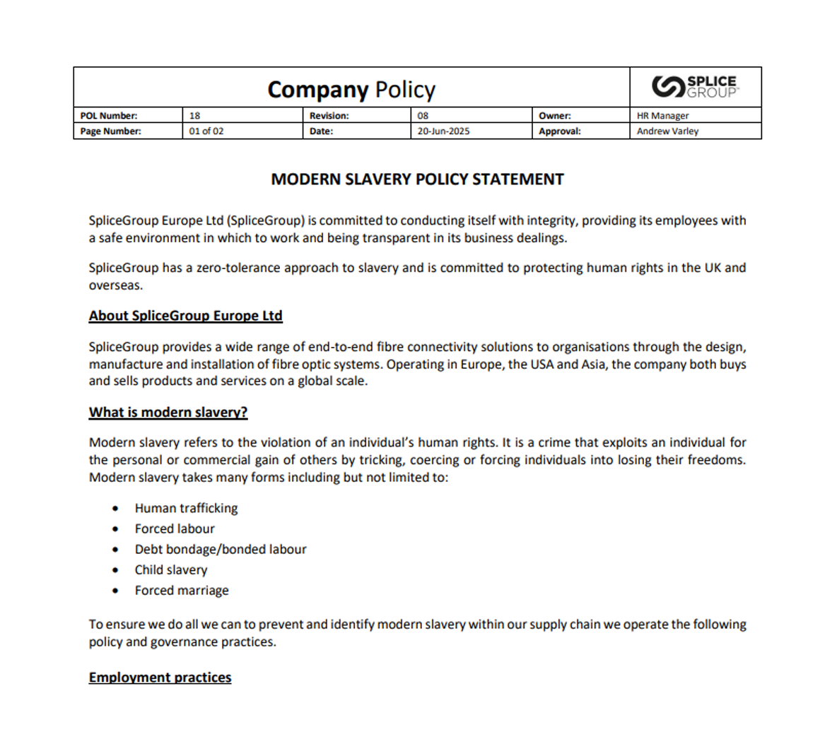 SpliceGroup Modern Slavery Policy Statement